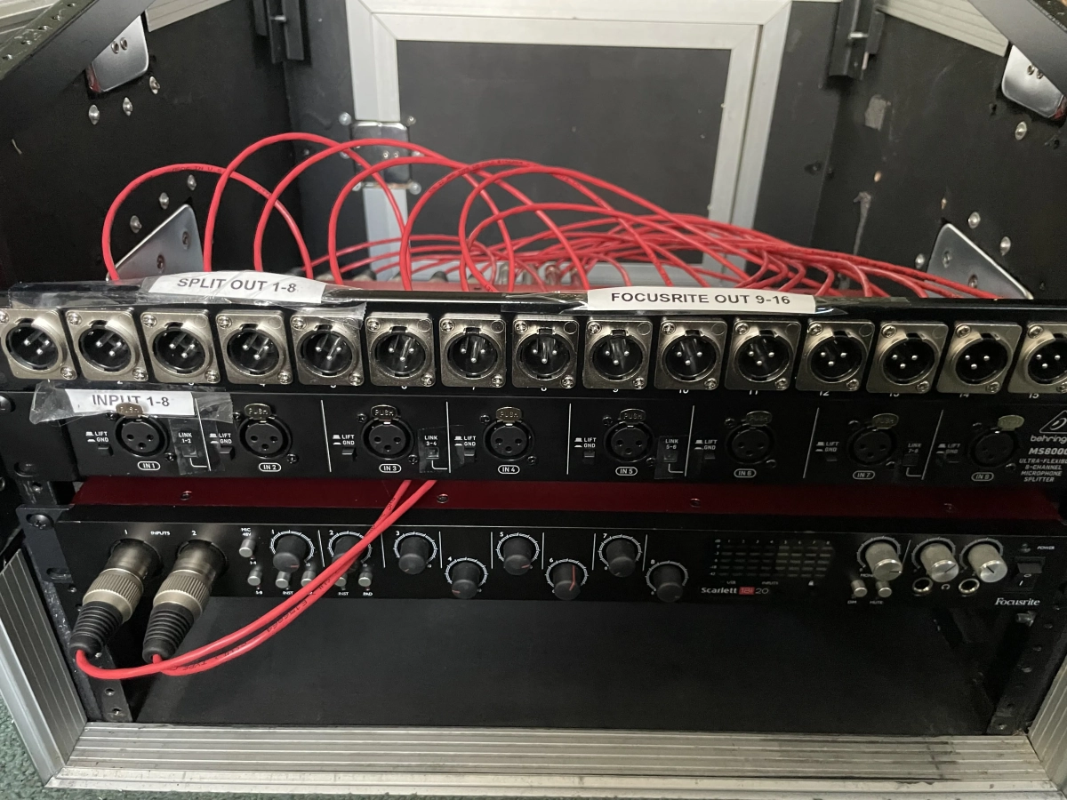 The heart of the system is a 16-port XLR patch bay I wired myself (thanks Niral from Infinite Cables for being awesome!), connecting to a Behringer MS8000 microphone splitter and integrated with our audio interface. My colleague Jack Sears and I spent an entire afternoon soldering all the XLR connectors and running the audio cables - it was quite the project, but his help made it possible to complete everything in one session. The whole system is housed in a compact rack case, making it both portable and professional.