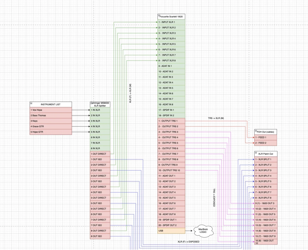 Beyond drumming with Stillcastle, I'm always working on technical projects to improve our performances. One of my proudest achievements was designing and building our own custom in-ear monitor system. I engineered the entire setup from scratch, starting with a detailed component design that included a rackmount splitter system, custom wiring configurations, and a patch bay for maximum flexibility. I also included a breakout cost sheet so we knew how much this would run us.