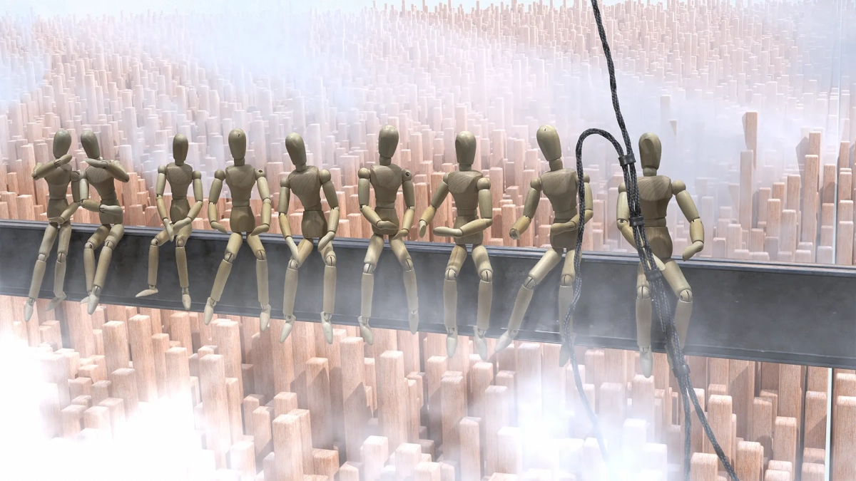 For this creative project, I sought to reimagine the iconic 1932 photograph “Lunch Atop a Skyscraper” by inserting mannequins in place of the workers. My initial idea was to simply photoshop the mannequins into the original photo. However, I soon realized this approach would not suffice due to the lack of sufficient background detail in the original and the complexity of blending the mannequins seamlessly. I pivoted to recreating the entire scene from scratch in Blender, which gave me full creative control. I started by modeling basic elements like the steel beam and rope. I then added 2D image planes of the mannequins, giving the illusion they were sitting atop the beam. After establishing the lighting and propor- tions, I created the ground using procedural geometry nodes for efficiency. Additional 2D planes simulated fog. Finally, I brought the render into Photoshop for minor tweaks like color grading and shadows to enhance realism.