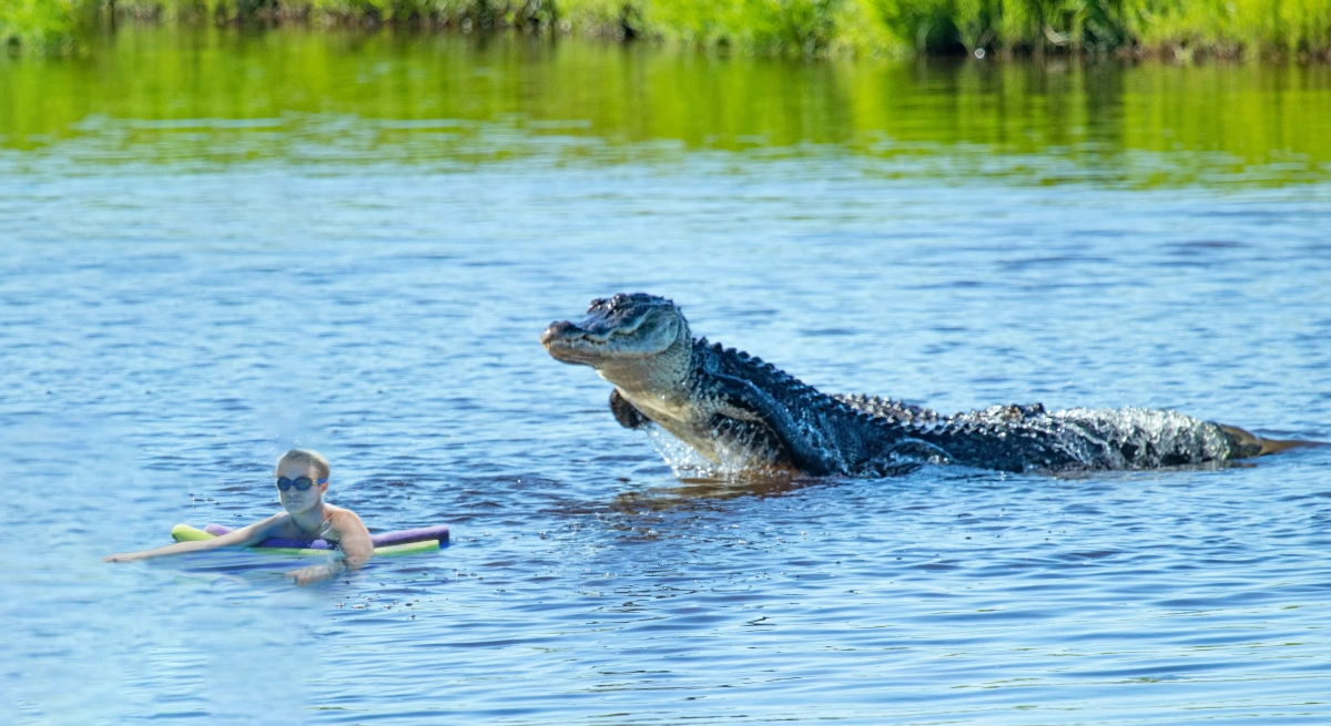 Through precise masking and blending techniques, I merged two distinct photographs - one of myself casually floating with a pool noodle, and another of an alligator in mid-launch - to craft a perfectly timed moment of apparent danger. The consistent lighting, water reflections, and natural color grading help sell the illusion while maintaining the whimsical nature of the concept.