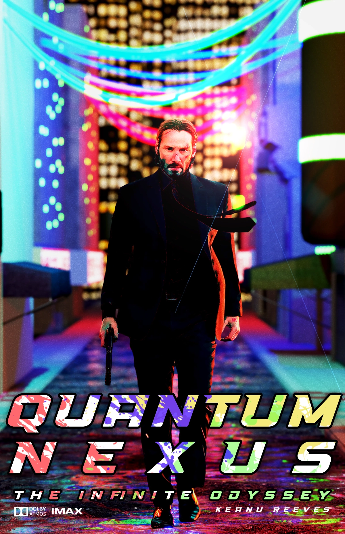 Centered within the composition is acclaimed actor Keanu Reeves, chosen for his unmatched capacity to compellingly blend action and emotional depth in science fiction storytelling. Underneath lies an imaginative movie title, "Quantum Nexus – The Infinite Odyssey," flanked by a custom graphic logo treatment intended to further capture the viewer's interest.