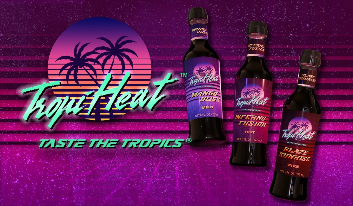 For this creative branding and packaging project, I wanted to develop an eye-catching and non-traditional hot sauce product line that stood out on shelves. Diverging from standard industry aesthetic conventions which utilize predictable color palettes and flat, boring label designs, I conceived and executed a vaporwave-inspired tropical brand and bottle set dubbed "TropiHeat - Taste the Tropics."
