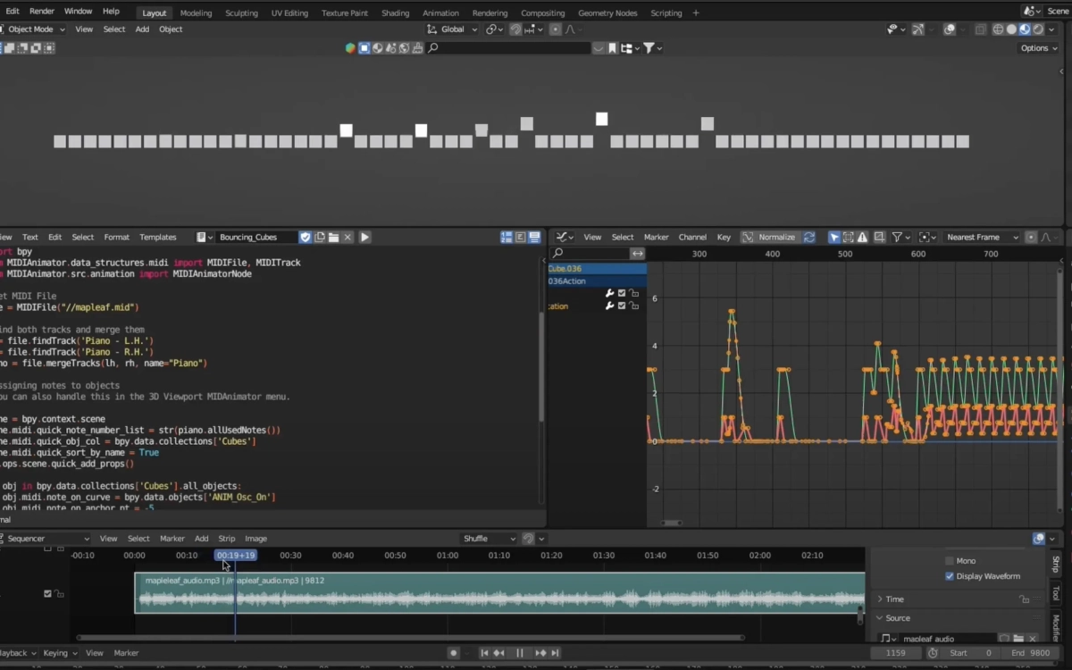 MIDIAnimator is an open-source tool that transforms musical scores into stunning 3D animations. Inspired by Wayne Lytle's groundbreaking work with Animusic in the 90s, it makes the magic of music visualization accessible to everyone. What started as a Summer Scholars research project at Capital University has evolved into a powerful animation system that lets musicians and artists create sophisticated visual representations of their music using Blender.